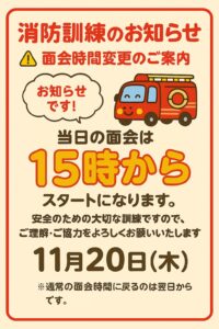11/20(木)の 面会時間変更のお知らせ(消防訓練のため) 未分類 2025.11.05平素より当施設の運営にご理解とご協力を賜り、誠にありがとうございます。このたび、消防署との合同による消防訓練を実施するにあたり、消防車両の駐車スペース確保のため、当日の面会開始時間を15時からとさせていただきます。ご利用者様・ご家族の皆様にはご不便をおかけいたしますが、安全確保および防災体制強化のための取り組みとなりますので、何卒ご理解とご協力のほどよろしくお願い申し上げます。※通常の面会時間に変更があるのは当日のみです。詳細は職員までお問い合わせください。